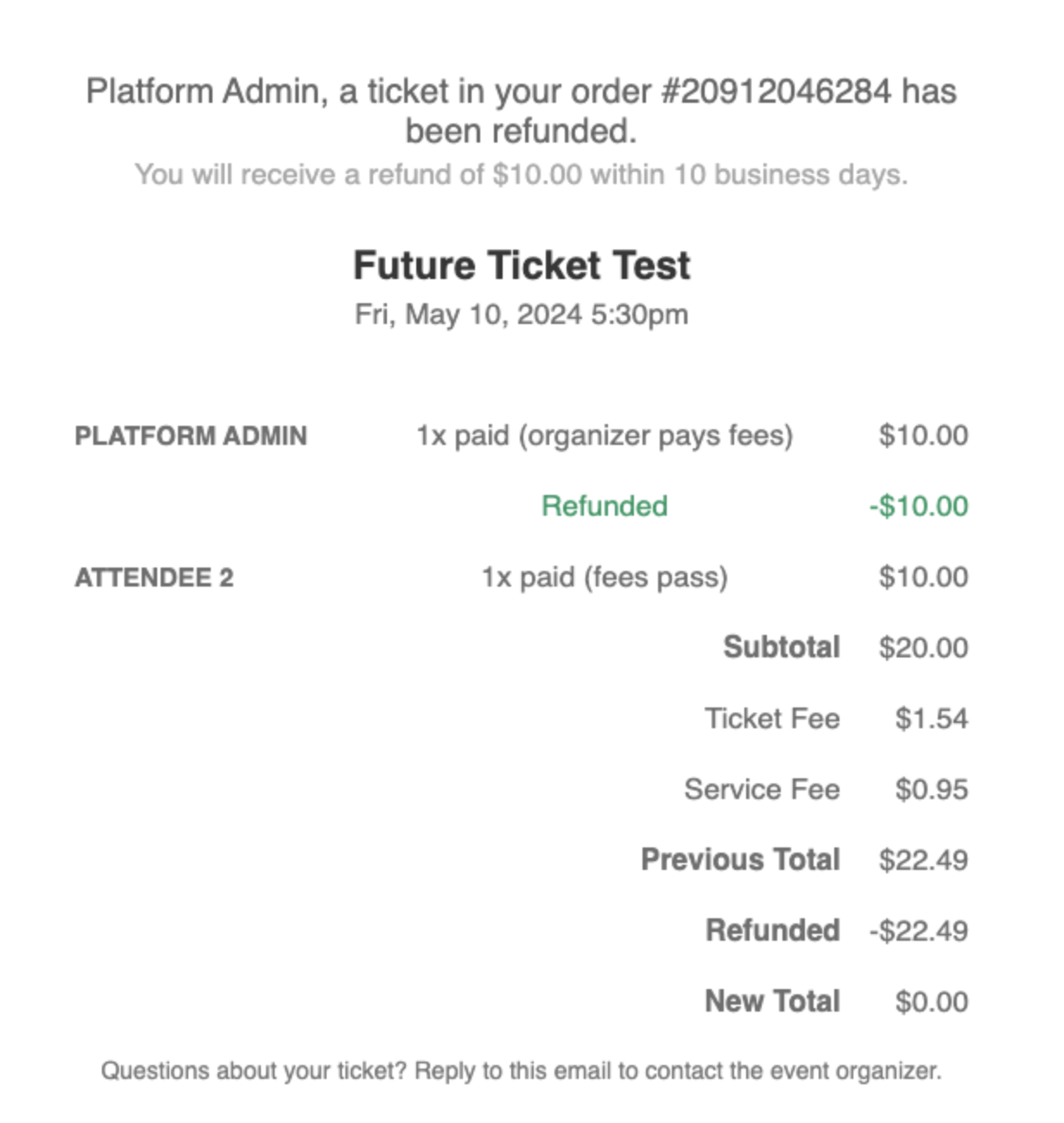 Emailed refund notifications will show which tickets were refunded on a separate line underneath.