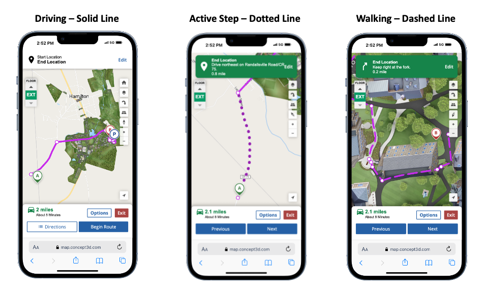 Improved Wayfinding Route Line Display for Walking vs. Driving vs. Active Steps