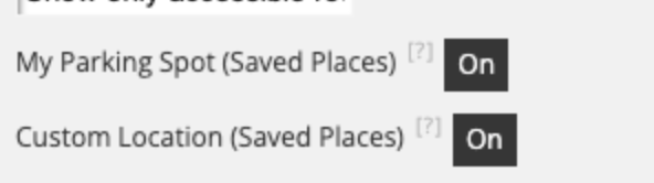 CMS users can now independently toggle the visibility of the Save Custom Location and Parking Spot features. When either feature is turned off, its related UI and any previously saved locations or parking spots are hidden from users. Disabling both will hide all related content, as though My Places is turned off entirely.
