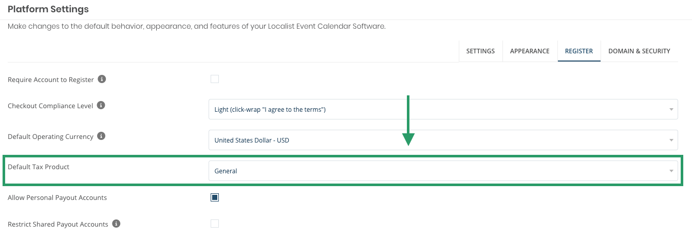 The default tax product can be set on your platform’s Register settings page in Admin.