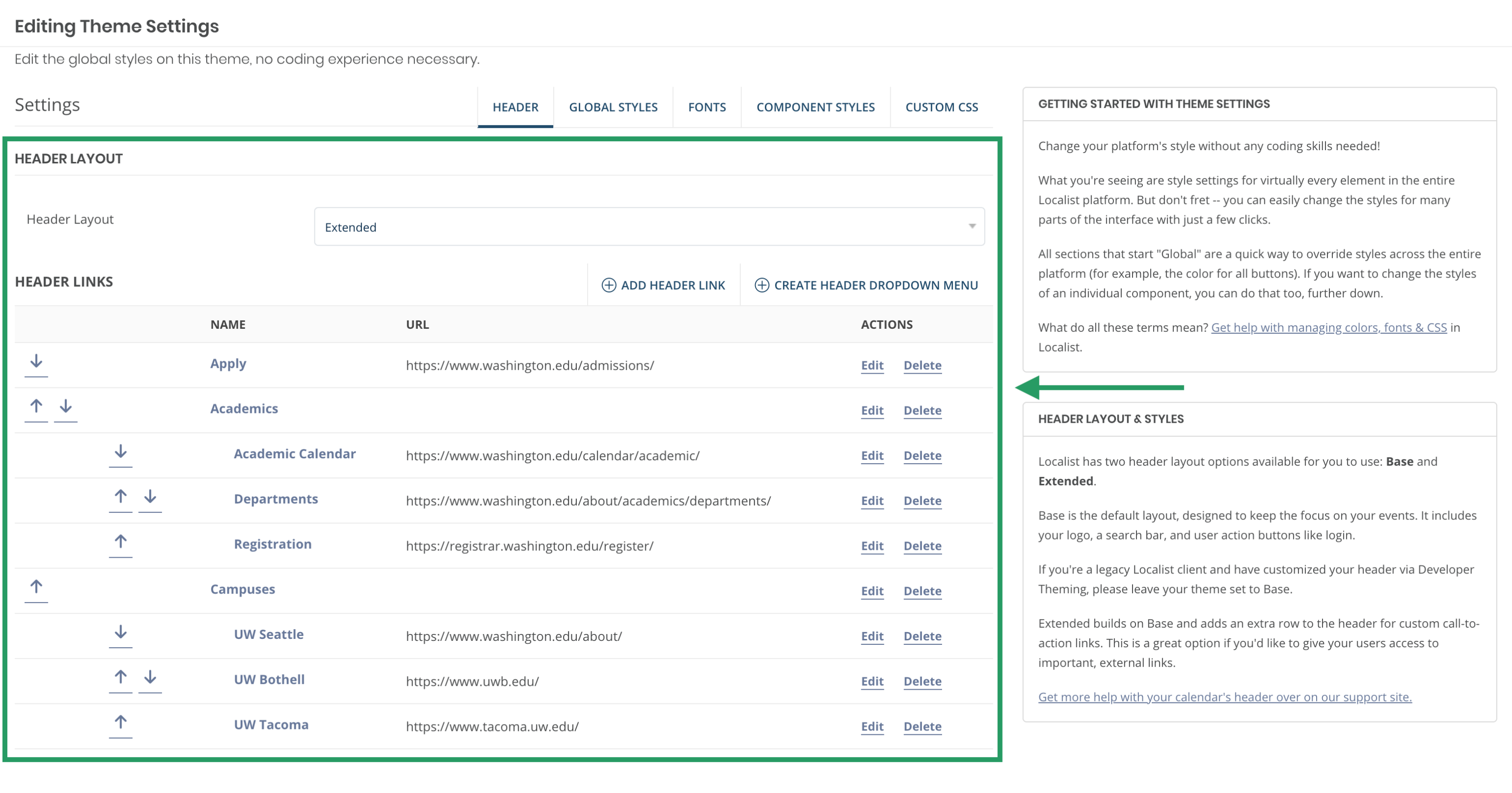 We’ve rolled out a brand new, “Extended” header layout! This new option gives you more flexibility to add custom links and dropdown menus to your calendar’s header. Theme Developers can now easily manage header links, reorder them, and create dropdowns for a more engaging and informative user experience with your Localist calendar.