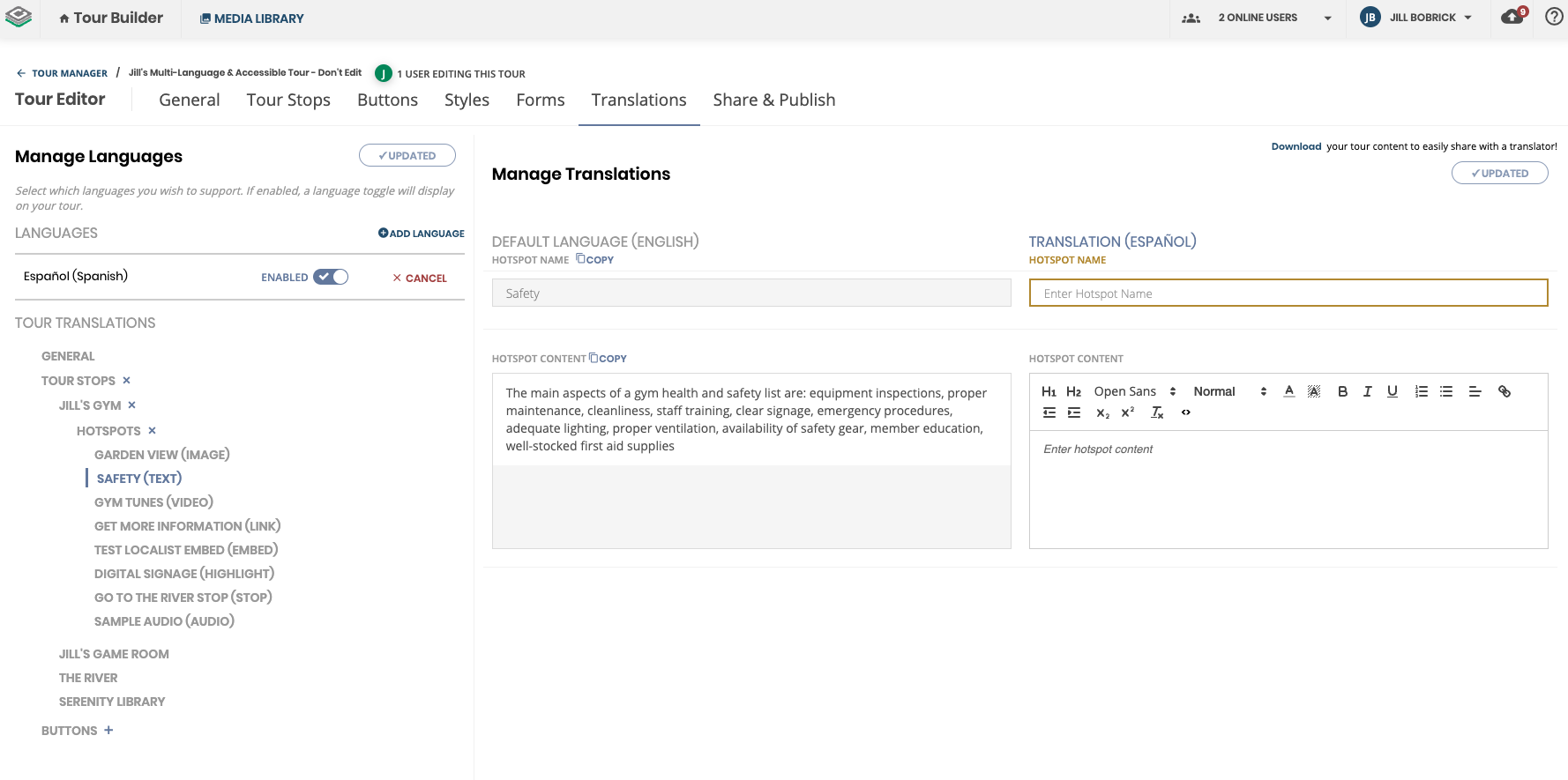 The 360° Tour now supports full multi-language translations for hotspots and audio content. Tour editors can translate hotspot names across all hotspot types (Stop, Link, Video, Image, Highlight, Pano, Audio, Embed, and Text), including the rich text content within Text Hotspots.
