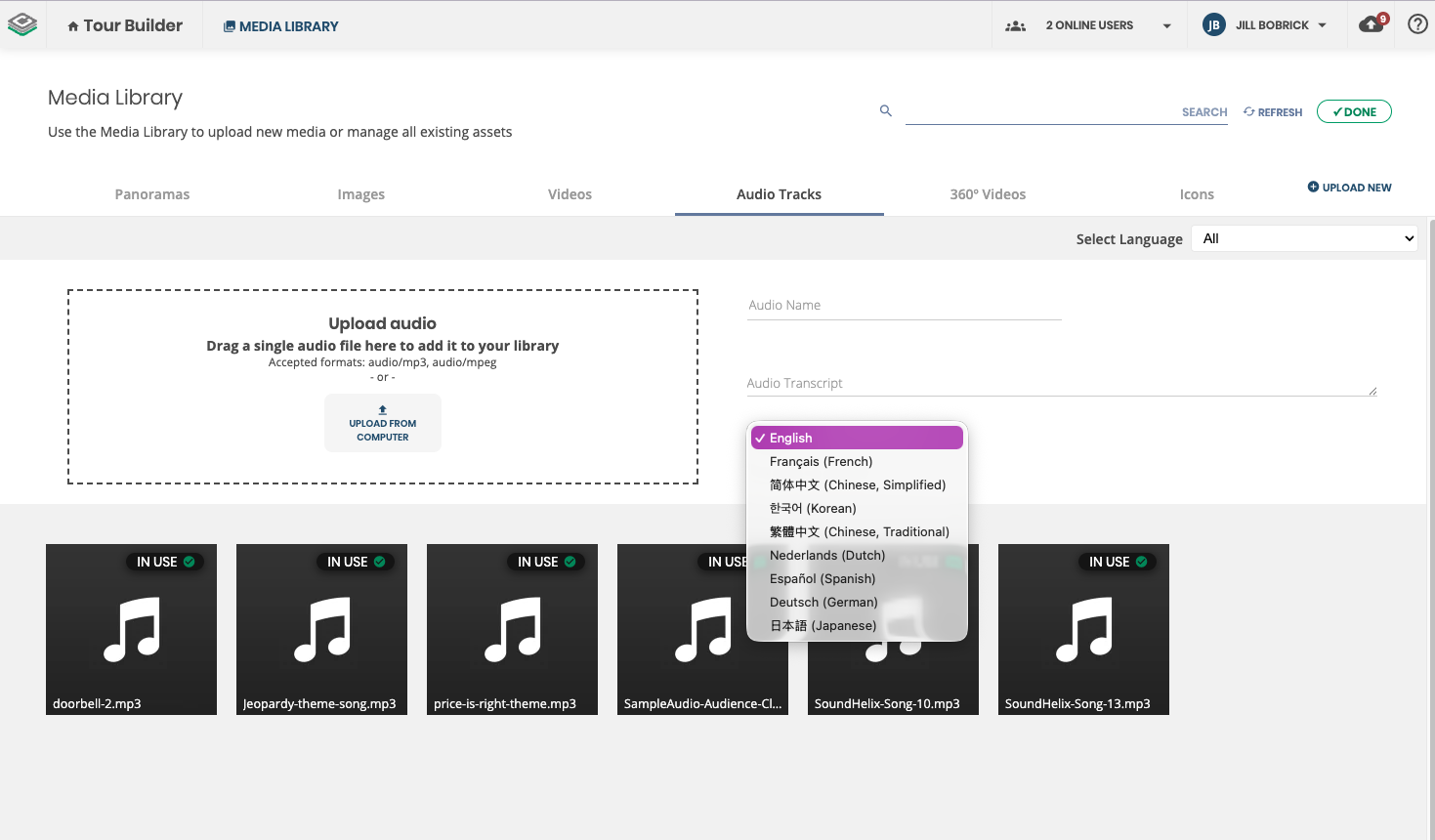 Audio translations are also now supported end to end. Editors can upload language-specific audio files and transcripts for both Hotspot Audio and Stop Audio directly from the Translations tab. The Media Library has been updated to support multi-language audio management, including: