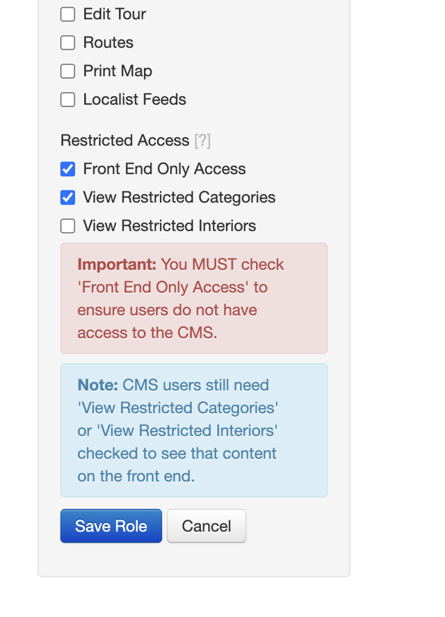 The Roles page in the CMS now separates CMS permissions from Restricted Access permissions into clearly labeled sections. "Front End Only Access," "View Restricted Categories," and "View Restricted Interiors" are grouped together with guidance text to help admins configure roles correctly. Previously, checking "Front End Only Access" hid all other permissions (not helpful), and restricted permission options appeared even when not enabled on the map (also not helpful).
