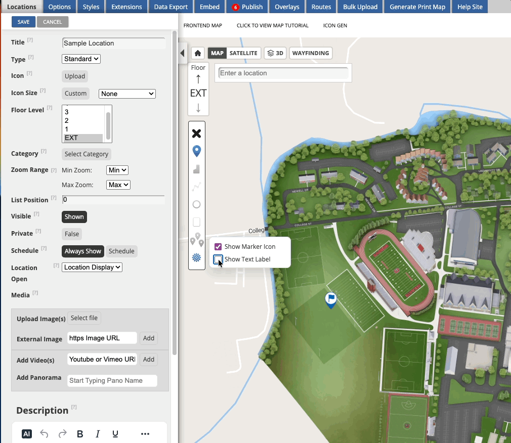 Map administrators now have more flexibility in how locations appear on the map. A new "Show Text" display option in the CMS location builder allows locations to be shown as their name in text, either on its own, alongside a marker, or on a polygon.