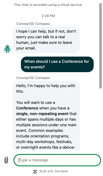 If your question requires hands-on troubleshooting or account-specific help, the chatbot may recommend contacting the Concept3D Support team. Just simply ask to speak to a real person and your request will be forwarded to Support for follow up.