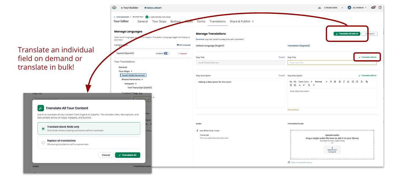 The 360° Tour Builder now includes built-in AI translation, making it easier than ever to offer multilingual tour experiences. Translating tour content has traditionally been one of the most time-consuming and costly steps in launching a multilingual tour. With AI translation, what once took hours of manual work can now be done in minutes.